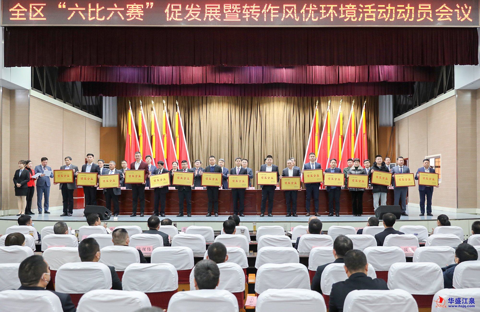 2月10日,羅莊區“六比六賽”促發展暨轉作風優環境活動動員會議召開,動員全區上下牢固樹立“項目為王、企業至上”的理念,一切圍繞企業轉,一切盯著項目干,努力跑出項目建設“加速度”,打造營商環境“金招牌”,展現作風建設“新氣象”,推動全區經濟社會高質量發展。為表揚先進、樹立典型,羅莊區委、區政府對2021年度具有特殊貢獻的先進企業進行了表彰。在此次受表彰的全區15家“2021年度龍榜企業”中,華盛江泉集團榮登榜首。沈泉莊黨委書記、華盛江泉集團常務副總經理、財務總監張毅參加動員會議并上臺領獎。